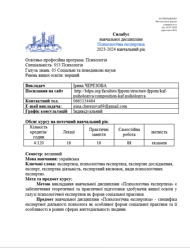 Психологічна експертиза : силабус навчальної дисципліни для ОПП Психологія на 2023-2024 навчальний рік