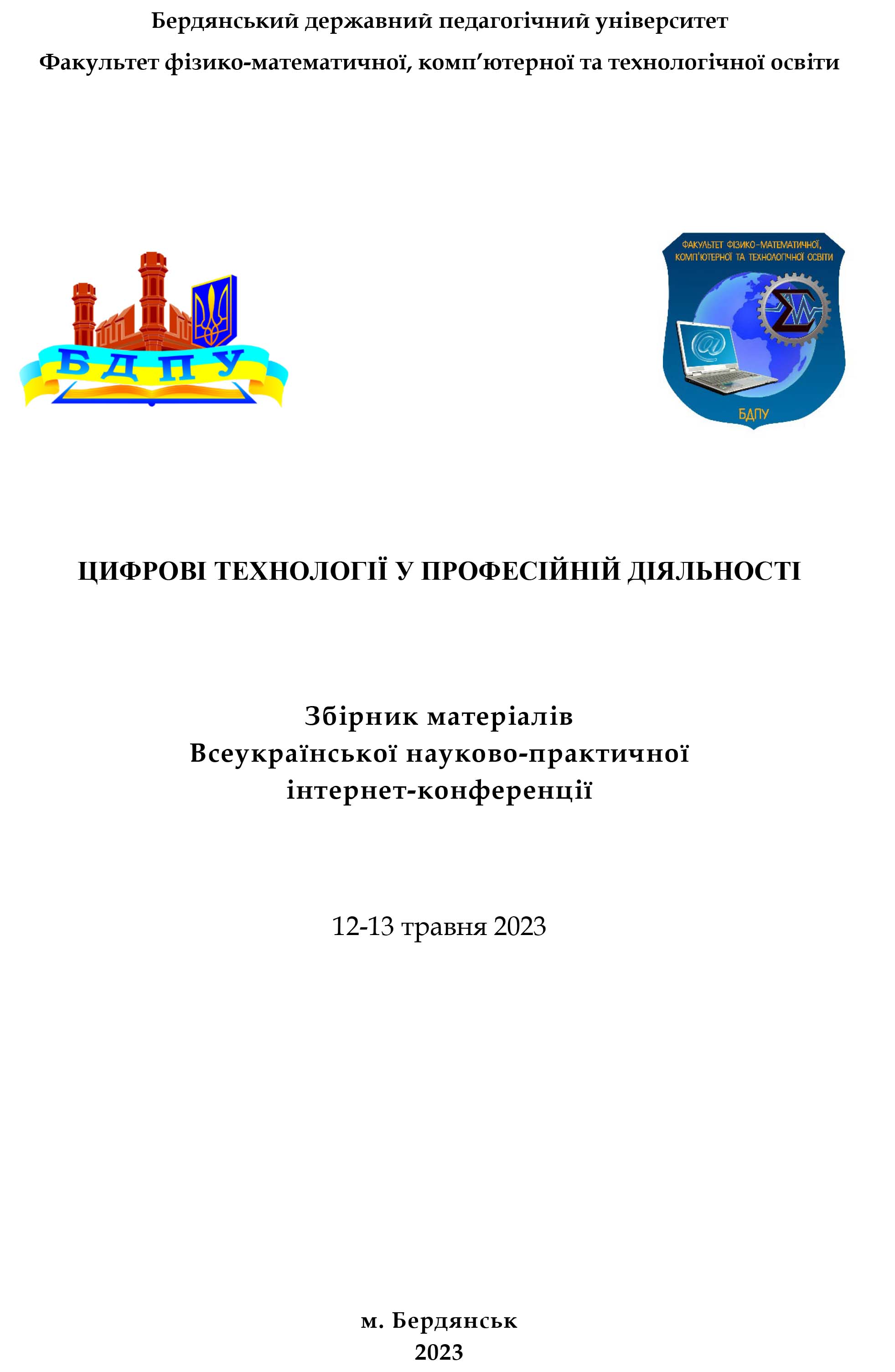 Цифрові технології у професійній діяльності : збірник матеріалів Всеукраїнської науково-практичної інтернет-конференції (12-13 травня 2023 р.) / відп. за комп’ютерну верстку О. С. Овсянніков. – Запоріжжя ; Бердянськ : БДПУ, 2023. – 164 с.