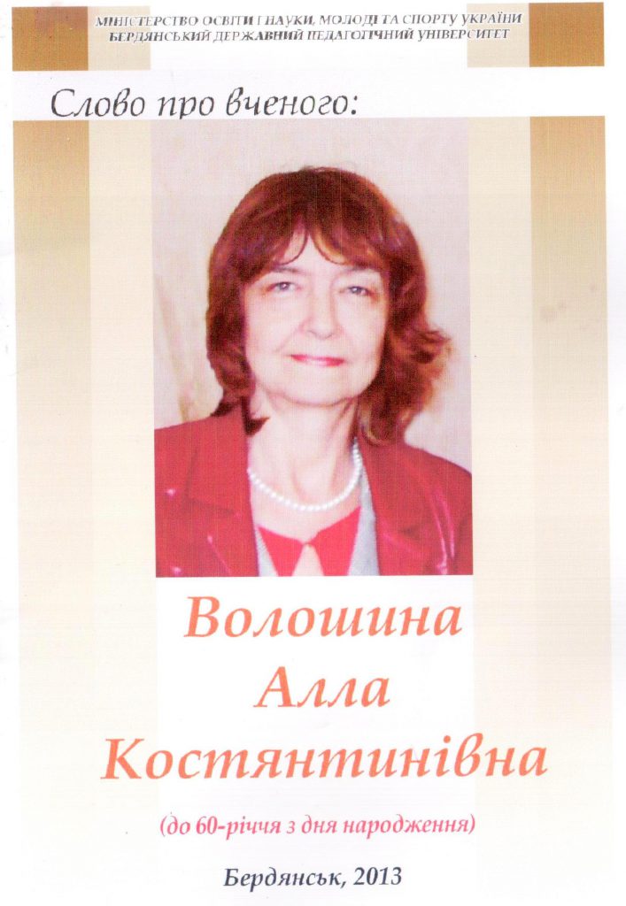 Слово про вченого: Волошина Алла Костянтинівна (до 60-річчя з дня народження) / відп. за випуск І. Т. Богданов (проректор з наукової роботи БДПУ) ; упоряд. та комп. набір : К. І. Константинова, В. М. Ліпич. – Бердянськ : БДПУ, 2013. – 24 с.