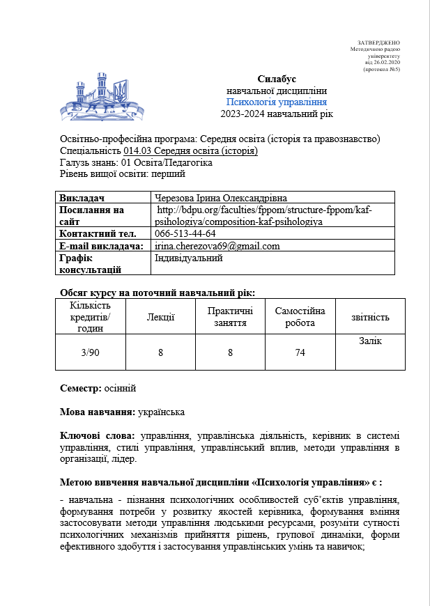 Психологія управління : силабус навчальної дисципліни для ОПП Середня освіта (історія та правознавство) на 2023-2024 навчальний рік