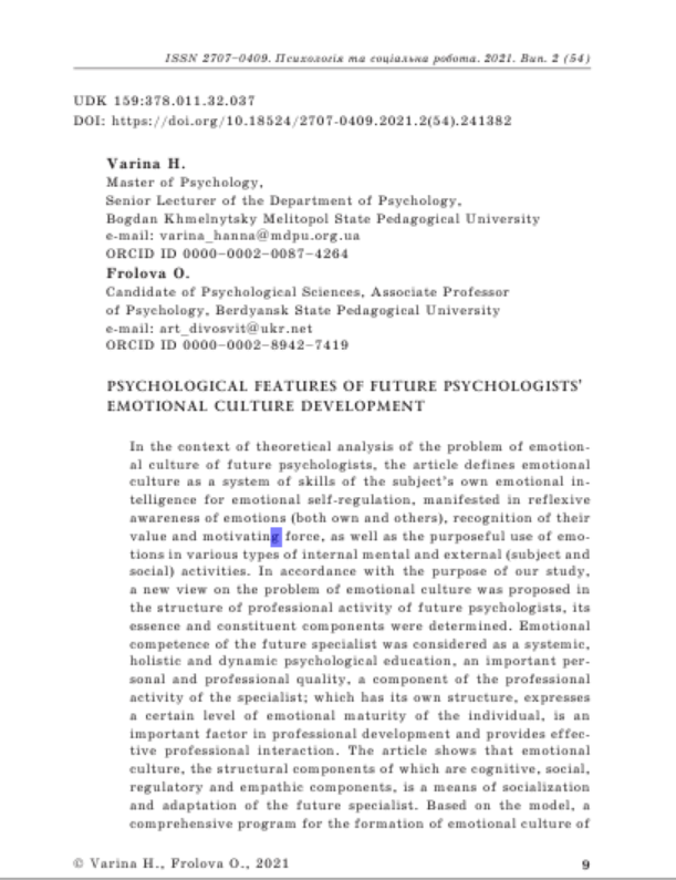 Frolova, O., Varina, H. (2021). Psychological features of future psychologists’ Emotional culture development. Психологія та соцільна робота, 2(54), 9–26.