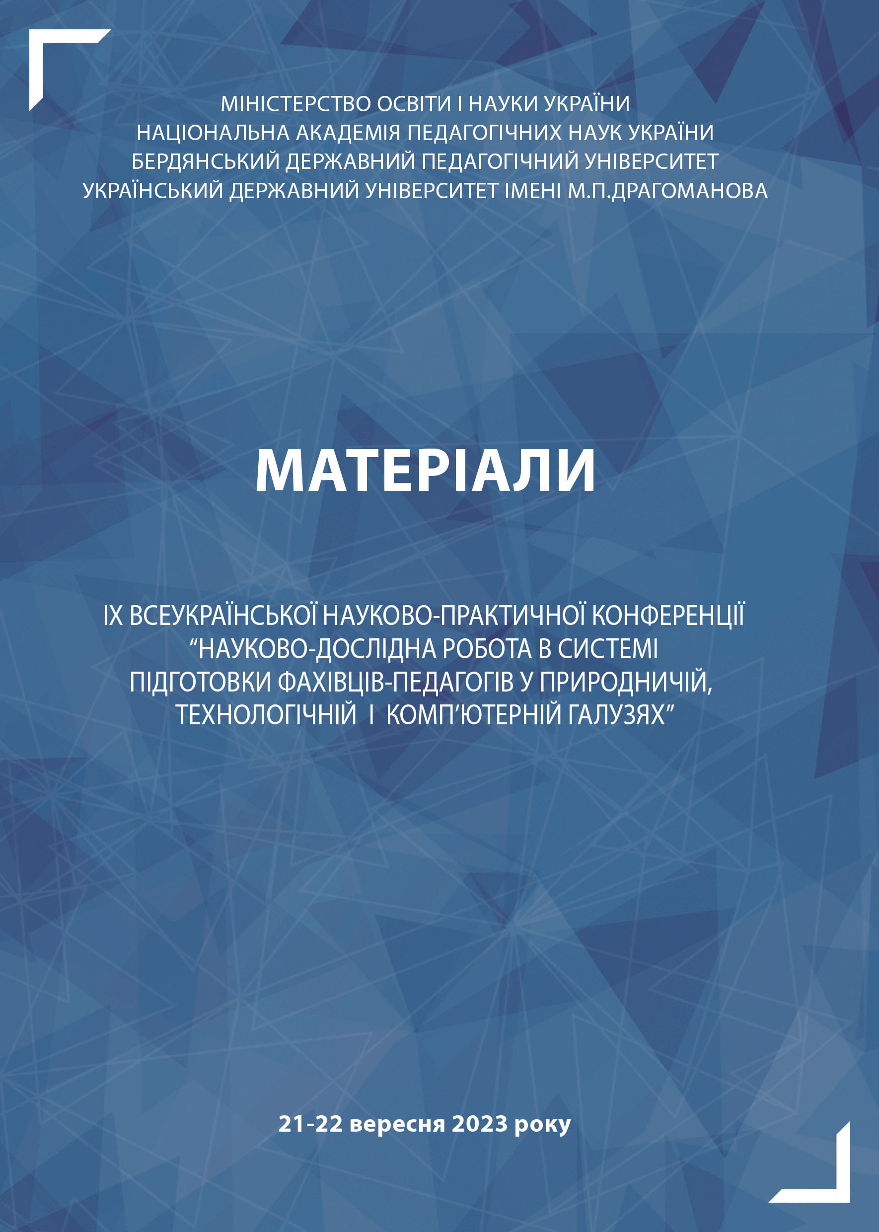 Науково-дослідна робота в системі підготовки фахівців-педагогів у природничій, технологічній і комп’ютерній галузях : матеріали ІХ Всеукраїнської науково-практичної Інтернет-конференції (21–22 вересня 2023 р.) / ред. кол. : М. І. Шут, І. Т. Богданов та ін. – Запоріжжя : БДПУ, 2023. – 192 с.